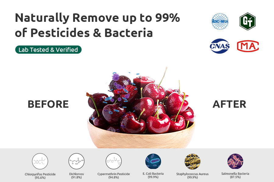 Tests performed by third-party labs have shown that MYVES-P1 can remove up to 99% of pesticides & bacteria like Glyphosate, Dichlorvos, E. coli, and Listeria from the surface of produce, without changing the flavor of the food itself.