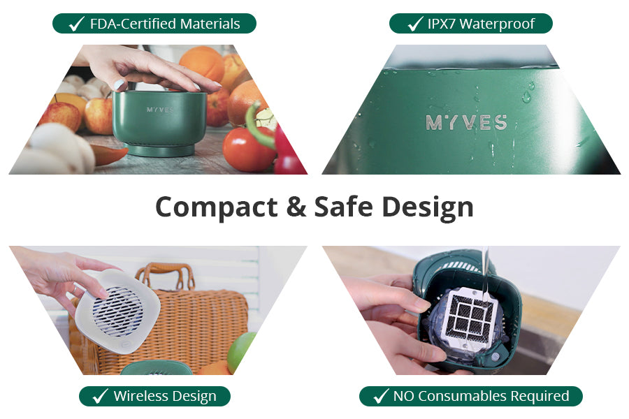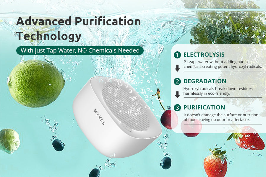 Revolutionize your produce cleaning with the MYVES® P1 Fruits & Veggies Purifier - NOT an Ultrasonic Vegetable Cleaner! Utilizing advanced OH radical tech, this portable, eco-friendly device removes up to 99% of pesticides & bacteria ensuring safer, cleaner meals for you and your family, without chemical adding.