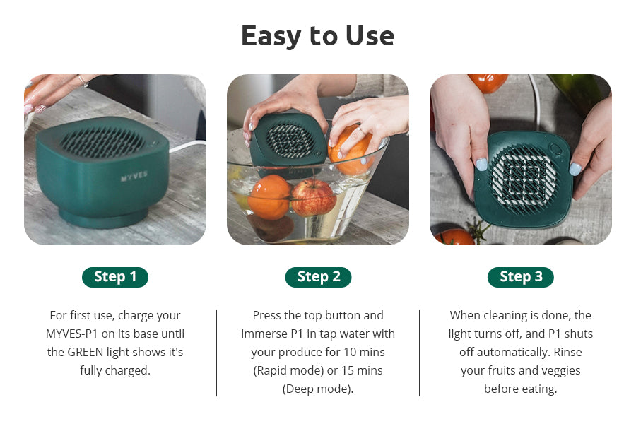 · Easy to Use: Simply submerge your produce in tap water, press the power button, and let P1 do the rest. It's hands-off and quick, making your food taste fresher and better.